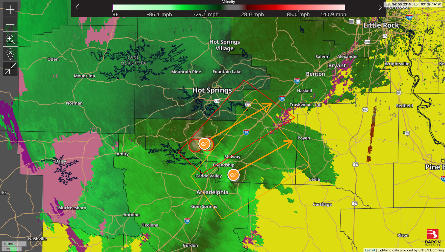 Part of Garland County is under a Tornado Warning, but most of the Hot Springs area is not. Part of Clark and Hot Spring county is in there. For those in the warning area, take cover immediately!