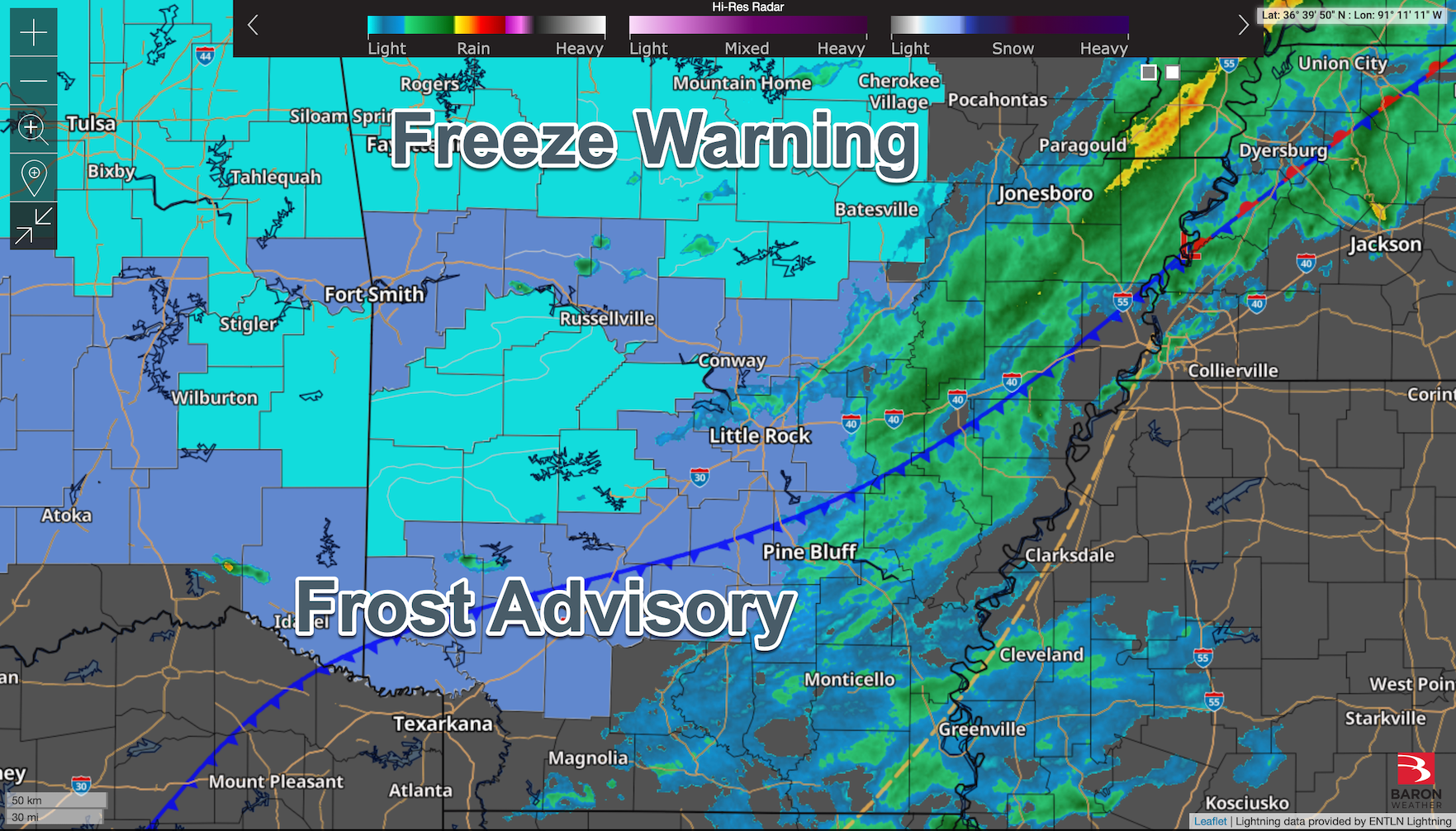 Parts of the state are under a Freeze Warning, and others are under a Frost Advisory. There are also some scattered showers across the state. Here’s the latest look at high-res radar, plus showing where the cold front is located.