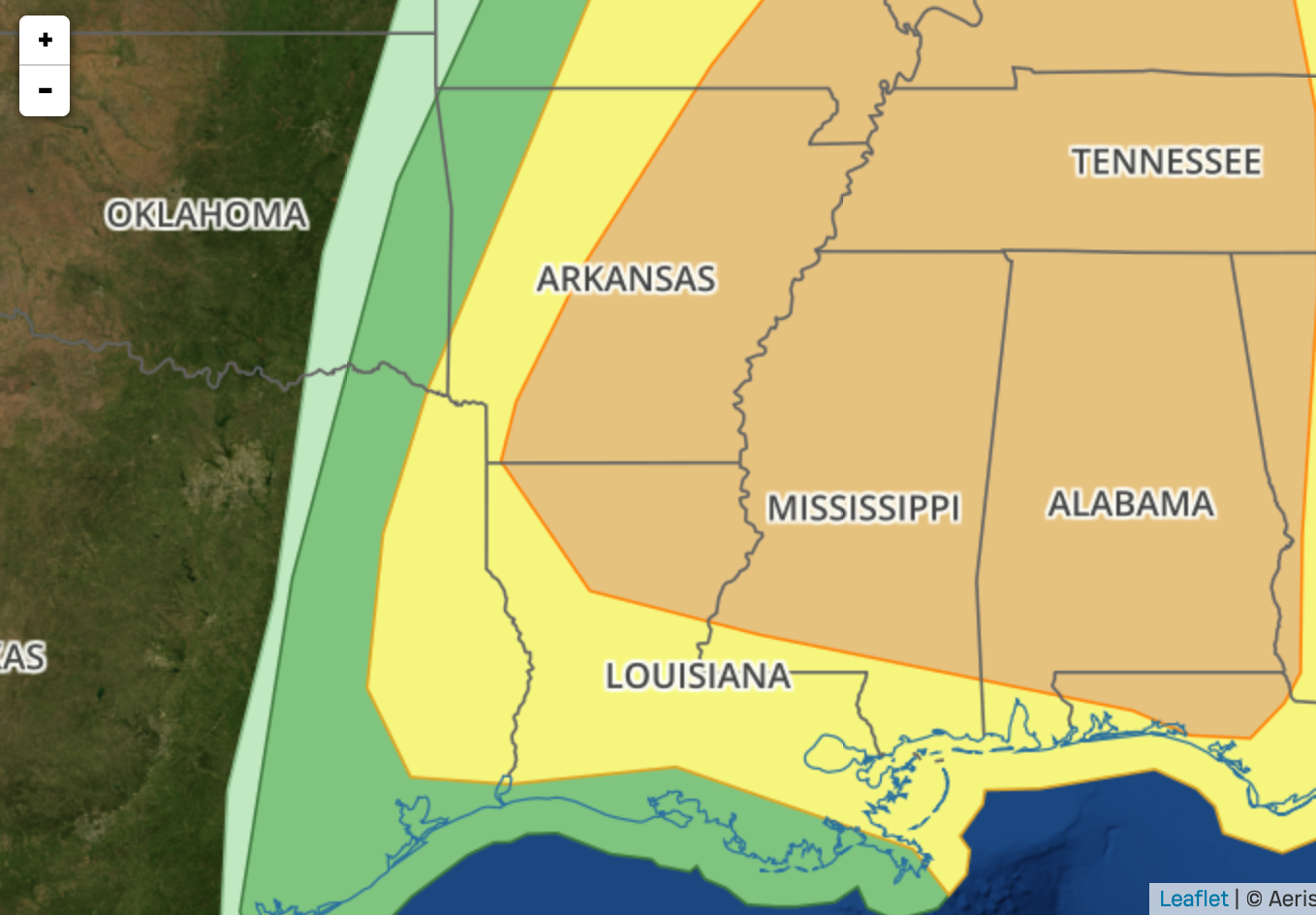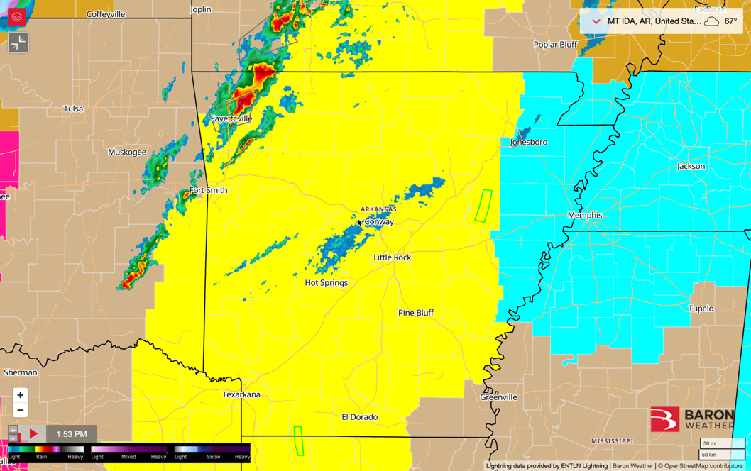 Tornado Watch for much of Arkansas. I’m also including the SPC Outlook Map for today (that map courtesy of AerisWeather/PWSWeather).